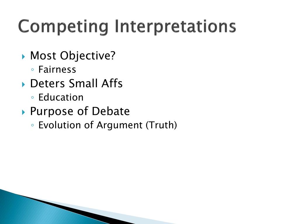 Competing Interpretations • Most Objective? • Fairness • Deters Small Affs • Education • Purpose of Debate • Evolution of Argument (Truth)