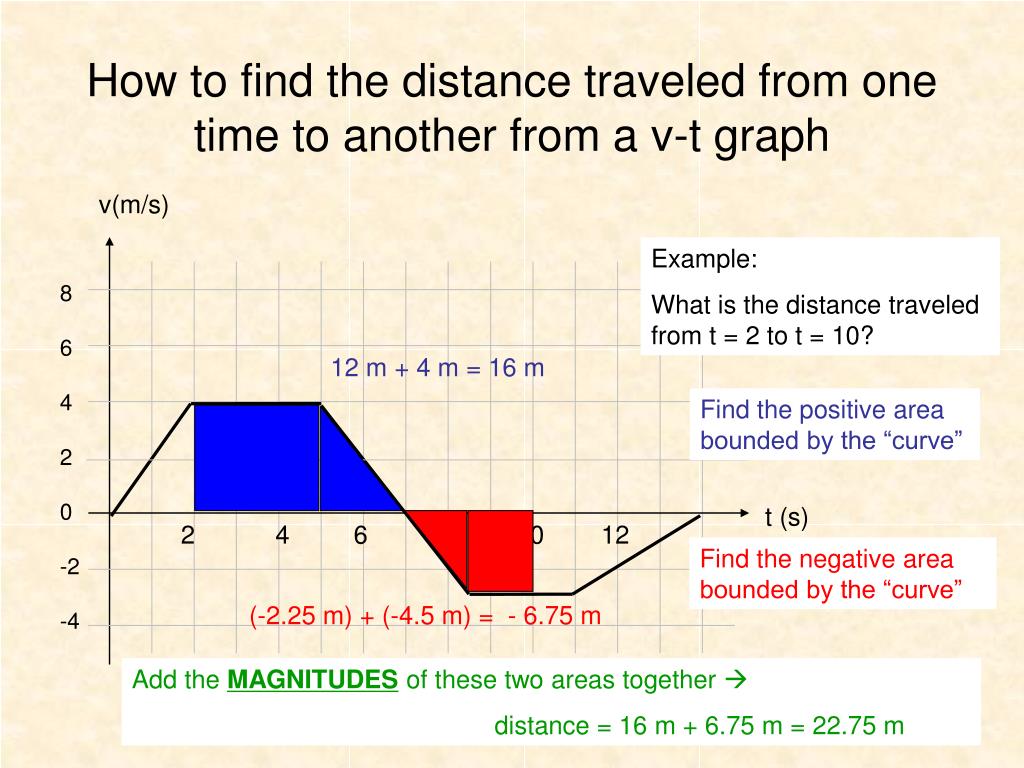 v(m/s) 8 6 4 2 0 -2 -4 12 m + 4 m = 16 m Find the positive area bounded by the “curve” t (s) 2 4 6 8 10 12 Find the negative area bounded by the “curve” (-2.25 m) + (-4.5 m) = - 6.75 m How to find the distance traveled from one time to another from a v-t graph Example: What is the distance traveled from t = 2 to t = 10? Add the MAGNITUDES of these two areas together distance = 16 m + 6.75 m = 22.75 m