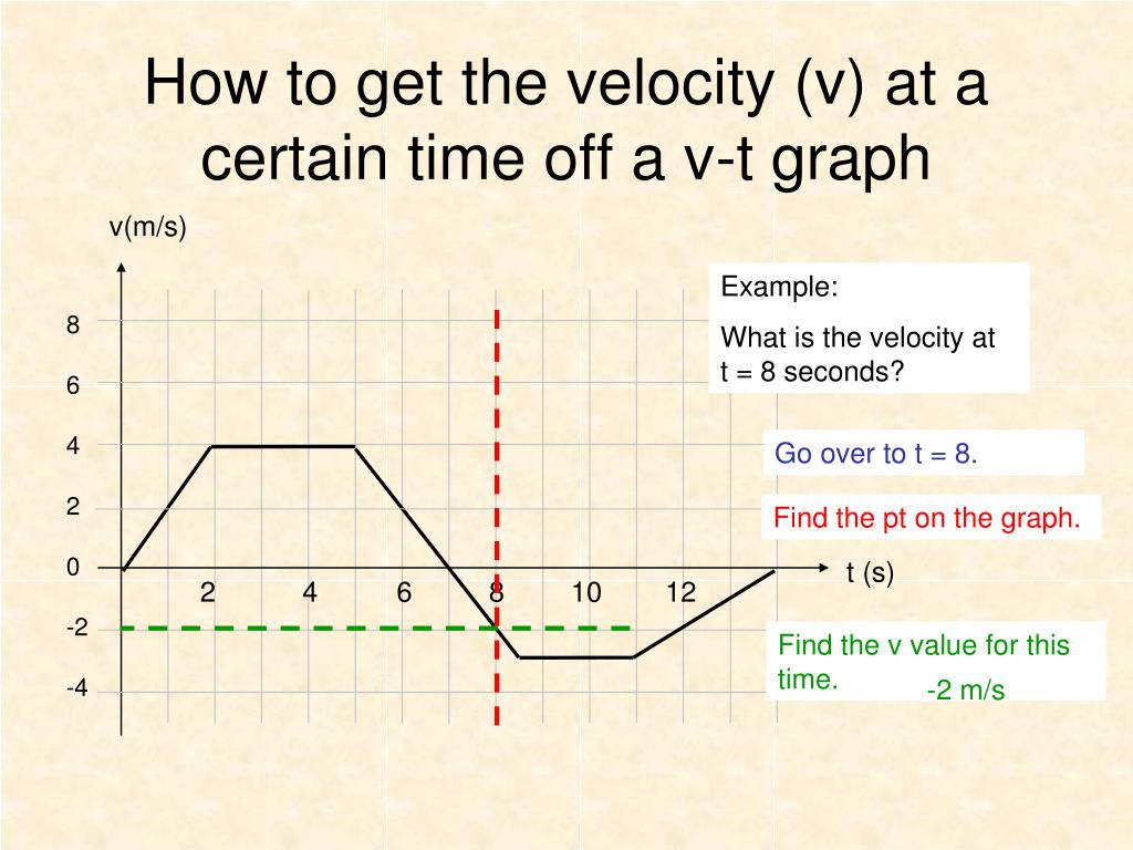 v(m/s) 8 6 4 2 0 -2 -4 t (s) 2 4 6 8 10 12 -2 m/s How to get the velocity (v) at a certain time off a v-t graph Example: What is the velocity at t = 8 seconds? Go over to t = 8. Find the pt on the graph. Find the v value for this time.