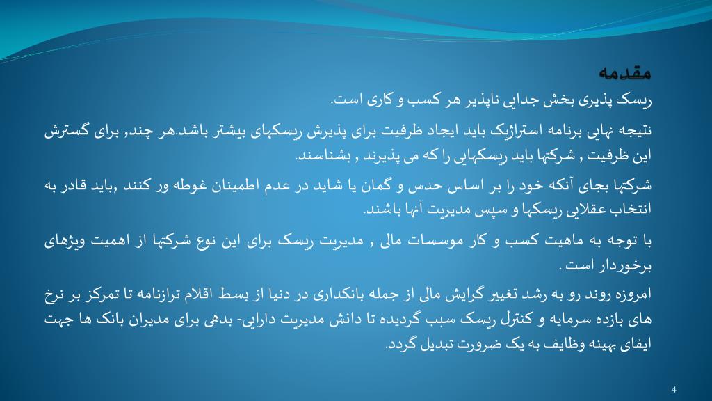 مقدمه ریسک پذیری بخش جدایی ناپذیر هر کسب و کاری است. نتیجه نهایی برنامه استراژیک باید ایجاد ظرفیت برای پذیرش ریسکهای بیشتر باشد.هر چند, برای گسترش این ظرفیت , شرکتها باید ریسکهایی را که می پذیرند , بشناسند. شرکتها بجای آنکه خود را بر اساس حدس و گمان یا شاید در عدم اطمینان غوطه ور کنند, باید قادر به انتخاب عقلایی ریسکها و سپس مدیریت آنها باشند. با توجه به ماهیت کسب و کار موسسات مالی , مدیریت ریسک برای این نوع شرکتها از اهمیت ویژهای برخوردار است . امروزه روند رو به رشد تغییر گرایش مالی از جمله بانکداری در دنیا از بسط اقلام ترازنامه تا تمرکز بر نرخ های بازده سرمایه و کنترل ریسک سبب گردیده تا دانش مدیریت دارایی- بدهی برای مدیران بانک ها جهت ایفای بهینه وظایف به یک ضرورت تبدیل گردد.