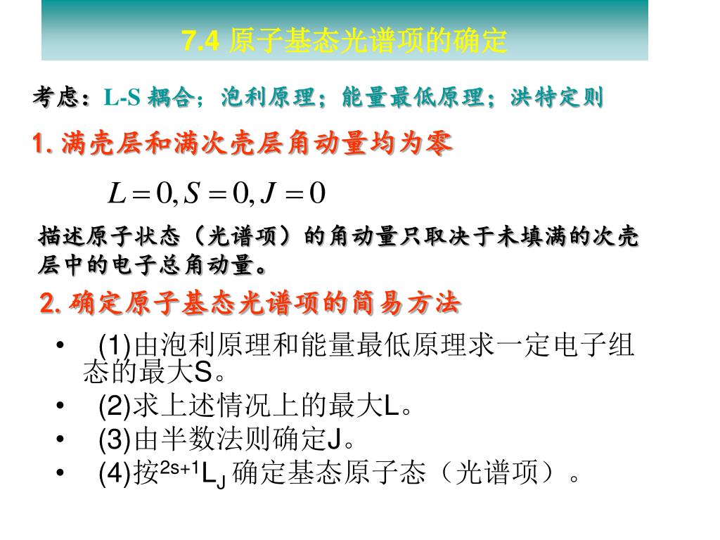 7.4 原子基态光谱项的确定 2.确定原子基态光谱项的简易方法 考虑:L-S 耦合;泡利原理;能量最低原理;洪特定则 1.满壳层和满次壳层角动量均为零 • (1)由泡利原理和能量最低原理求一定电子组态的最大S。 • (2)求上述情况上的最大L。 • (3)由半数法则确定J。 • (4)按2s+1LJ 确定基态原子态(光谱项)。 描述原子状态(光谱项)的角动量只取决于未填满的次壳层中的电子总角动量。