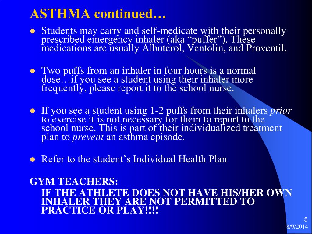 ASTHMA continued… • Students may carry and self-medicate with their personally prescribed emergency inhaler (aka “puffer”). These medications are usually Albuterol, Ventolin, and Proventil. • Two puffs from an inhaler in four hours is a normal dose…if you see a student using their inhaler more frequently, please report it to the school nurse. • If you see a student using 1-2 puffs from their inhalers prior to exercise it is not necessary for them to report to the school nurse. This is part of their individualized treatment plan to prevent an asthma episode. • Refer to the student’s Individual Health Plan GYM TEACHERS: IF THE ATHLETE DOES NOT HAVE HIS/HER OWN INHALER THEY ARE NOT PERMITTED TO PRACTICE OR PLAY!!!!