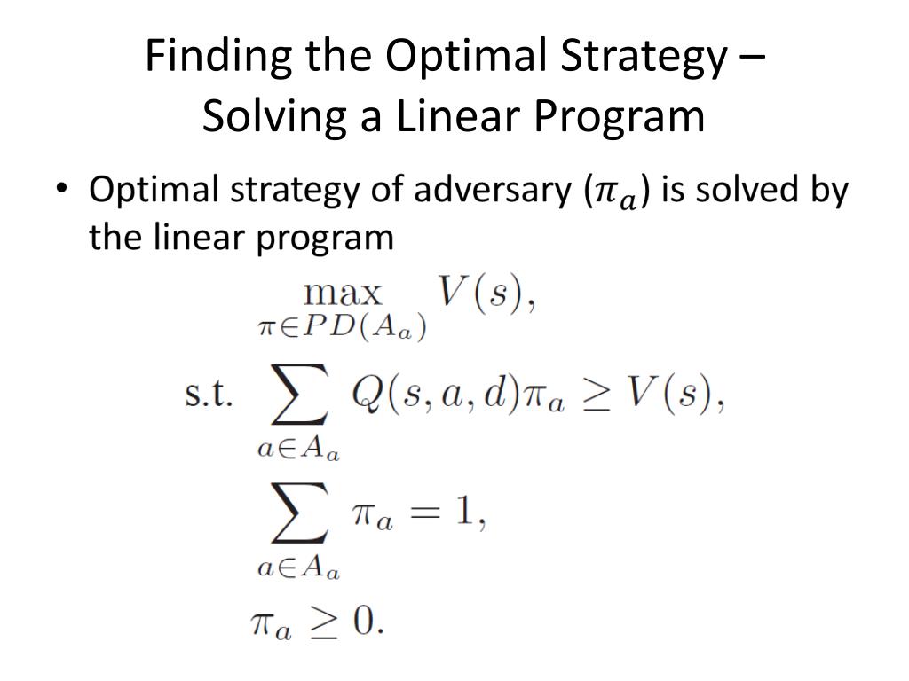 Markov Decision Process (MDP) • Example (2 states, each has 2 actions available) 0.9 0.1 0.1 0.9 Defend Recover up down No defend No recover 0.1 0.6 0.4 0.9 Only models one intelligent player