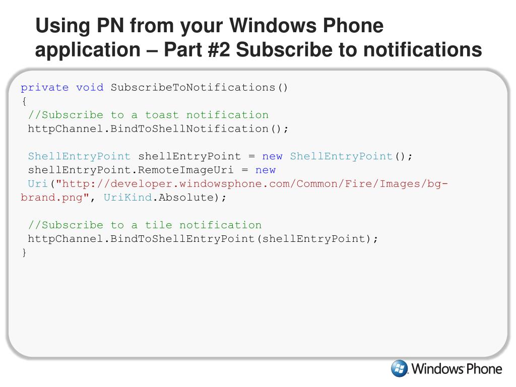 Using PN from your Windows Phone application – Part #2 Subscribe to notifications privatevoidSubscribeToNotifications() { //Subscribe to a toast notification httpChannel.BindToShellNotification(); ShellEntryPointshellEntryPoint = newShellEntryPoint(); shellEntryPoint.RemoteImageUri= new Uri("http://developer.windowsphone.com/Common/Fire/Images/bg-brand.png", UriKind.Absolute); //Subscribe to a tile notification httpChannel.BindToShellEntryPoint(shellEntryPoint); }