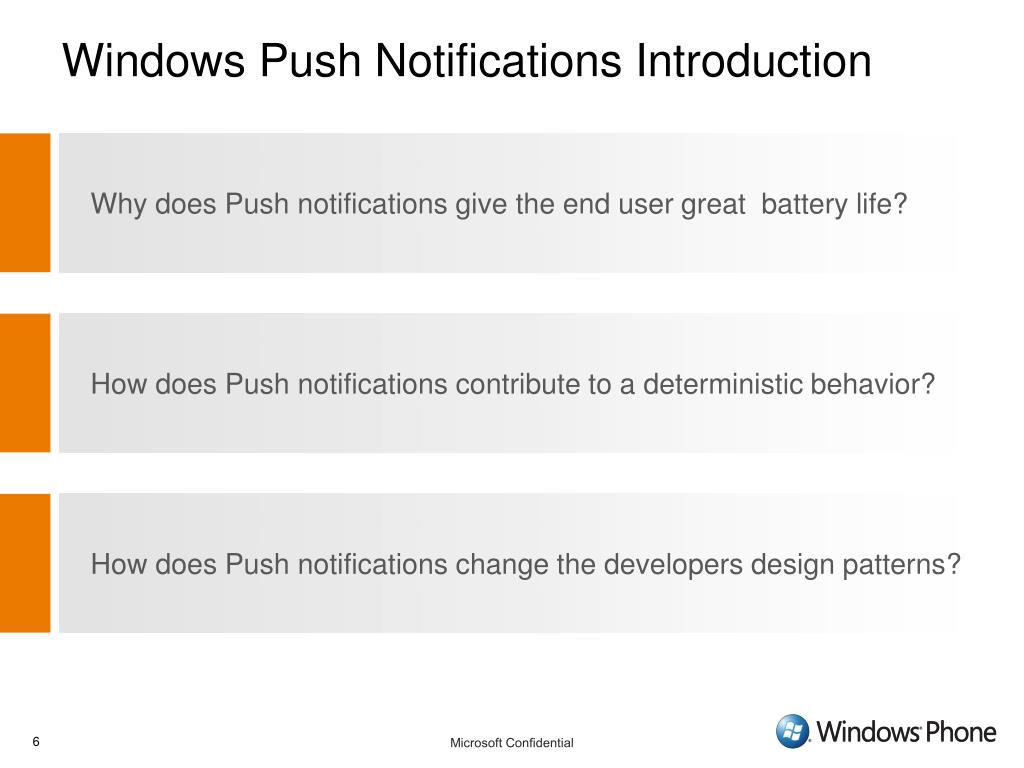 Windows Push Notifications Introduction • Why does Push notifications give the end user great battery life? • How does Push notifications contribute to a deterministic behavior? • How does Push notifications change the developers design patterns?
