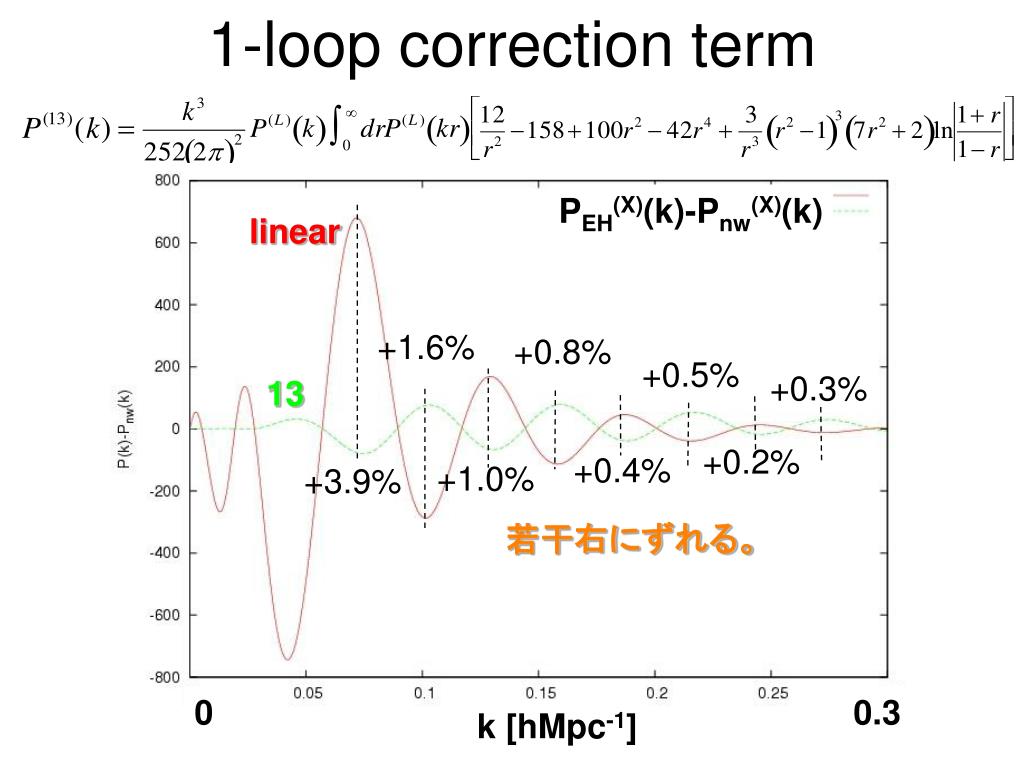 P(L)(k-q) k-q -k+q k -k q -q P(L)(q) 1-loop correction term 積分してしまうと、P(22)(k)はkの関数 として振動の特徴は小さい。 Power全体のshapeに対して 寄与するが、振動にはあまり 影響しない。 ※