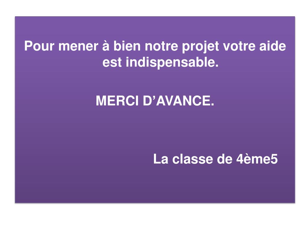 Pour mener à bien notre projet votre aide est indispensable. MERCI D’AVANCE. La classe de 4ème5