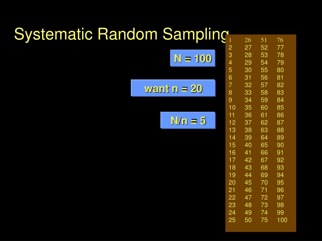 Systematic Random Sampling 1 26 51 76 2 27 52 77 3 28 53 78 4 29 54 79 5 30 55 80 6 31 56 81 7 32 57 82 8 33 58 83 9 34 59 84 10 35 60 85 11 36 61 86 12 37 62 87 13 38 63 88 14 39 64 89 15 40 65 90 16 41 66 91 17 42 67 92 18 43 68 93 19 44 69 94 20 45 70 95 21 46 71 96 22 47 72 97 23 48 73 98 24 49 74 99 25 50 75 100 N = 100