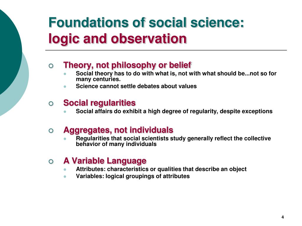 Foundations of social science:logic and observation • Theory, not philosophy or belief • Social theory has to do with what is, not with what should be...not so for many centuries. • Science cannot settle debates about values • Social regularities • Social affairs do exhibit a high degree of regularity, despite exceptions • Aggregates, not individuals • Regularities that social scientists study generally reflect the collective behavior of many individuals • A Variable Language • Attributes: characteristics or qualities that describe an object • Variables: logical groupings of attributes