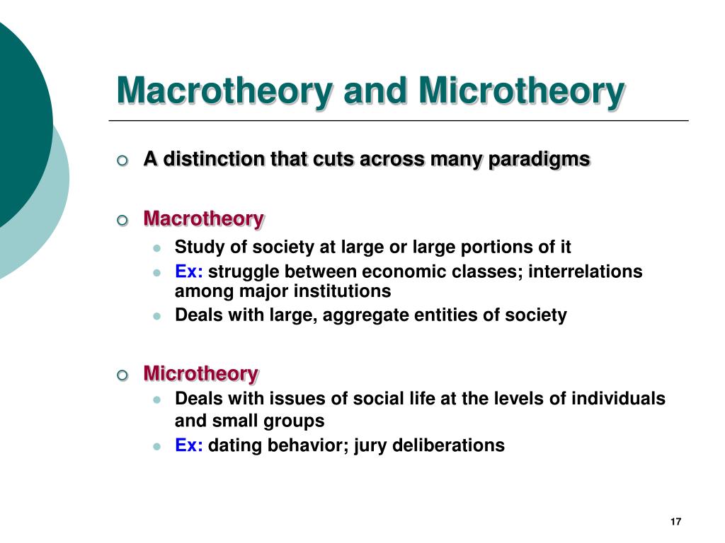 Macrotheory and Microtheory • A distinction that cuts across many paradigms • Macrotheory • Study of society at large or large portions of it • Ex: struggle between economic classes; interrelations among major institutions • Deals with large, aggregate entities of society • Microtheory • Deals with issues of social life at the levels of individuals and small groups • Ex: dating behavior; jury deliberations