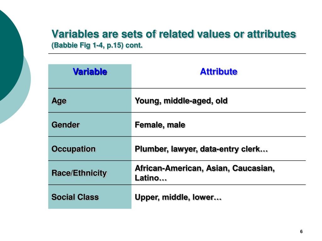 Variables are sets of related values or attributes(Babbie Fig 1-4, p.15) cont.