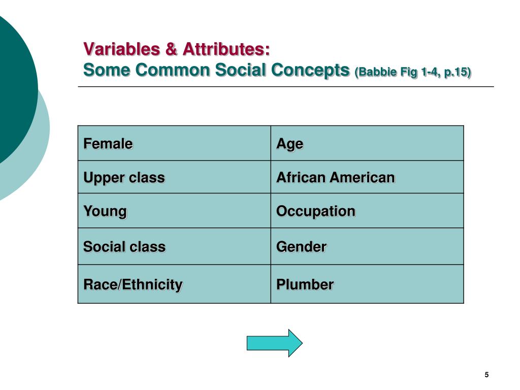 Variables & Attributes:Some Common Social Concepts (Babbie Fig 1-4, p.15)