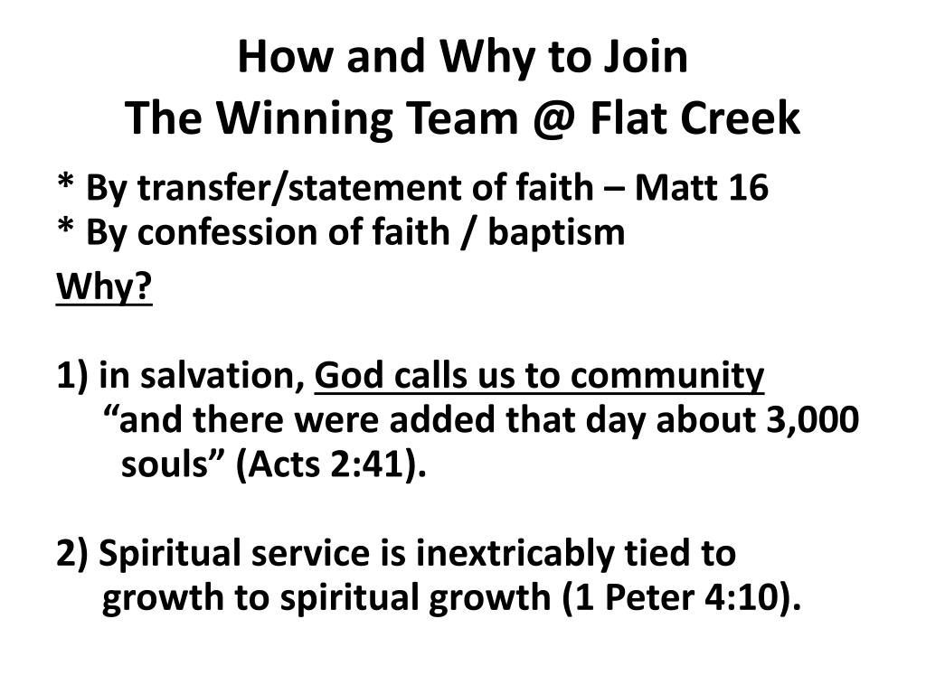 How and Why to Join The Winning Team @ Flat Creek * By transfer/statement of faith – Matt 16* By confession of faith / baptism Why?1) in salvation, God calls us to community “and there were added that day about 3,000 souls” (Acts 2:41). 2) Spiritual service is inextricably tied to growth to spiritual growth (1 Peter 4:10).