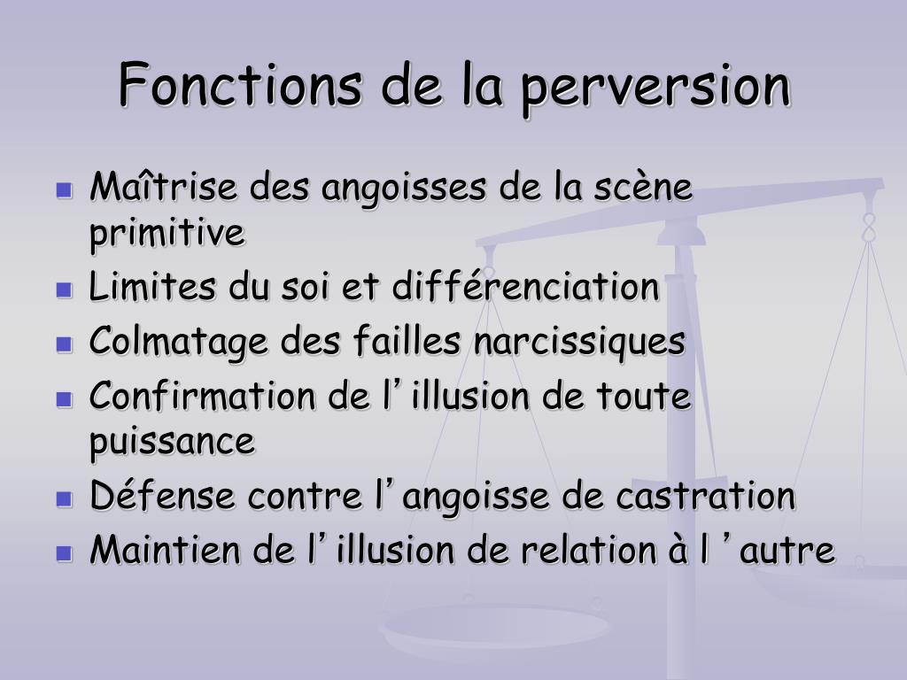 Fonctions de la perversion • Maîtrise des angoisses de la scène primitive • Limites du soi et différenciation • Colmatage des failles narcissiques • Confirmation de l’illusion de toute puissance • Défense contre l’angoisse de castration • Maintien de l’illusion de relation à l ’autre