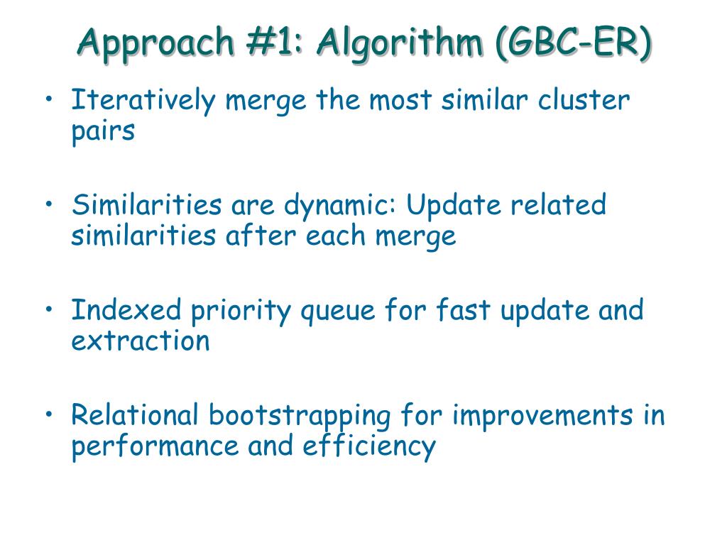 Approach #1: Algorithm (GBC-ER) • Iteratively merge the most similar cluster pairs • Similarities are dynamic: Update related similarities after each merge • Indexed priority queue for fast update and extraction • Relational bootstrapping for improvements in performance and efficiency