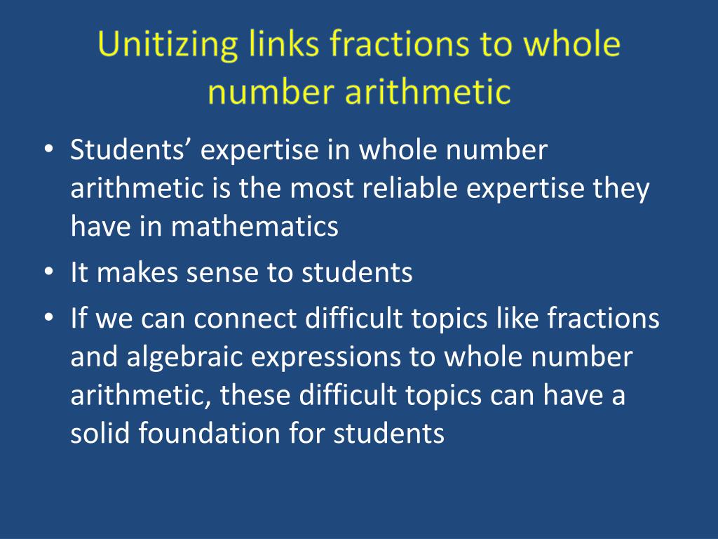 Unitizing links fractions to whole number arithmetic • Students’ expertise in whole number arithmetic is the most reliable expertise they have in mathematics • It makes sense to students • If we can connect difficult topics like fractions and algebraic expressions to whole number arithmetic, these difficult topics can have a solid foundation for students
