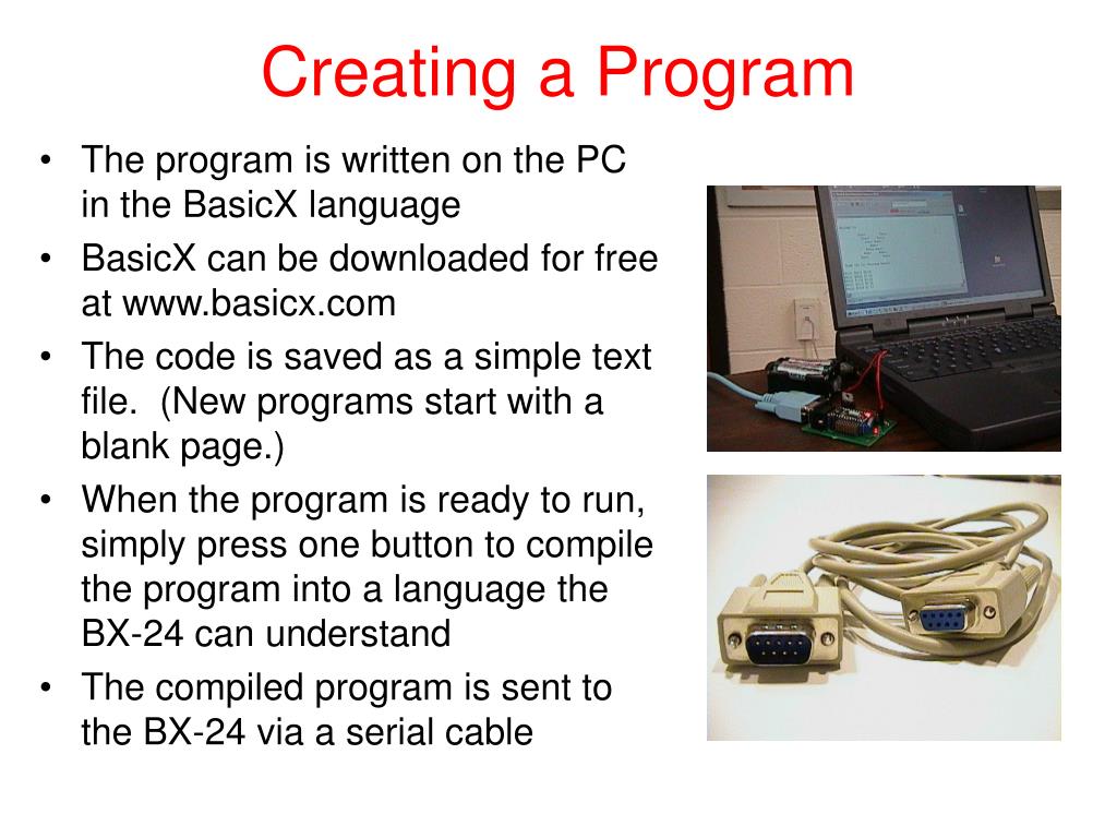 Creating a Program • The program is written on the PC in the BasicX language • BasicX can be downloaded for free at www.basicx.com • The code is saved as a simple text file. (New programs start with a blank page.) • When the program is ready to run, simply press one button to compile the program into a language the BX-24 can understand • The compiled program is sent to the BX-24 via a serial cable