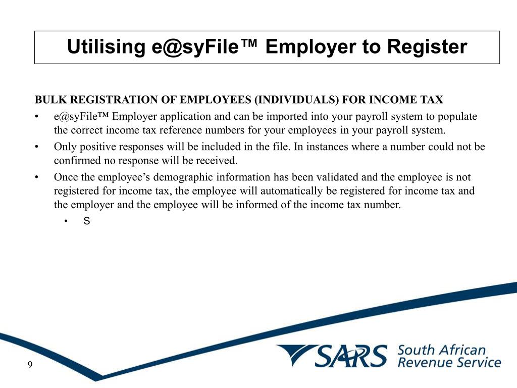 Utilising e@syFile™ Employer to Register BULK REGISTRATION OF EMPLOYEES (INDIVIDUALS) FOR INCOME TAX • e@syFile™ Employer application and can be imported into your payroll system to populate the correct income tax reference numbers for your employees in your payroll system. • Only positive responses will be included in the file. In instances where a number could not be confirmed no response will be received. • Once the employee’s demographic information has been validated and the employee is not registered for income tax, the employee will automatically be registered for income tax and the employer and the employee will be informed of the income tax number. • S 9