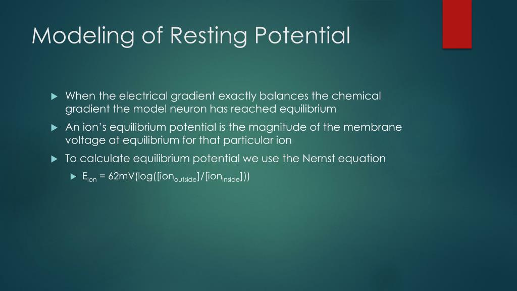 Modeling of Resting Potential • When the electrical gradient exactly balances the chemical gradient the model neuron has reached equilibrium • An ion’s equilibrium potential is the magnitude of the membrane voltage at equilibrium for that particular ion • To calculate equilibrium potential we use the Nernst equation • Eion= 62mV(log([ionoutside]/[ioninside]))