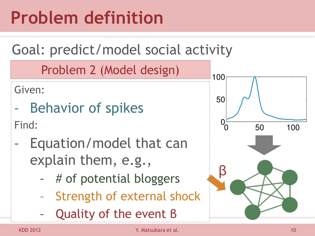 Problem definition Problem 1 (What-if?) β Given: Network of bloggers/users External shock/event Quality of the event β Find: How blogging activity will evolve over time Goal: predict/model social activity Y. Matsubara et al.
