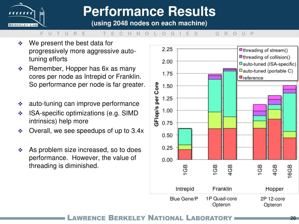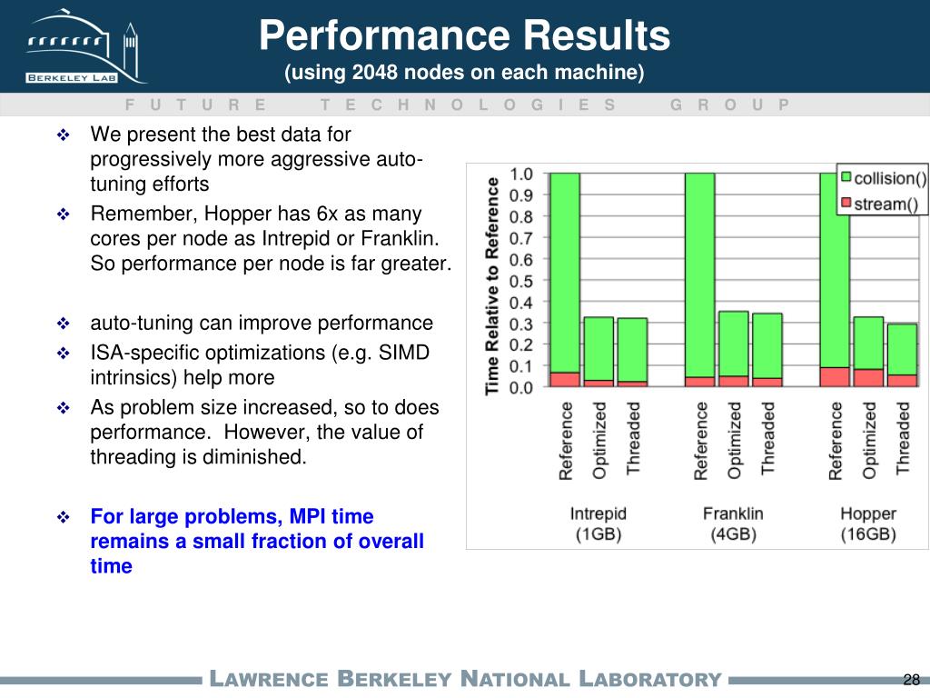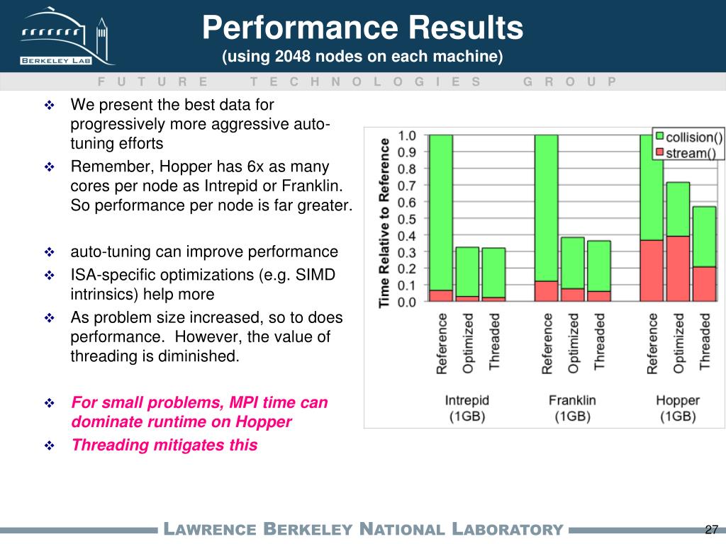 Performance Results(using 2048 nodes on each machine) We present the best data for progressively more aggressive auto-tuning efforts Remember, Hopper has 6x as many cores per node as Intrepid or Franklin. So performance per node is far greater. auto-tuning can improve performance ISA-specific optimizations (e.g. SIMD intrinsics) help more As problem size increased, so to does performance. However, the value of threading is diminished. For large problems, MPI time remains a small fraction of overall time