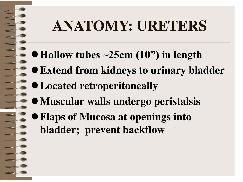 Hollow tubes ~25cm (10”) in length Extend from kidneys to urinary bladder Located retroperitoneally Muscular walls undergo peristalsis Flaps of Mucosa at openings into bladder; prevent backflow ANATOMY: URETERS