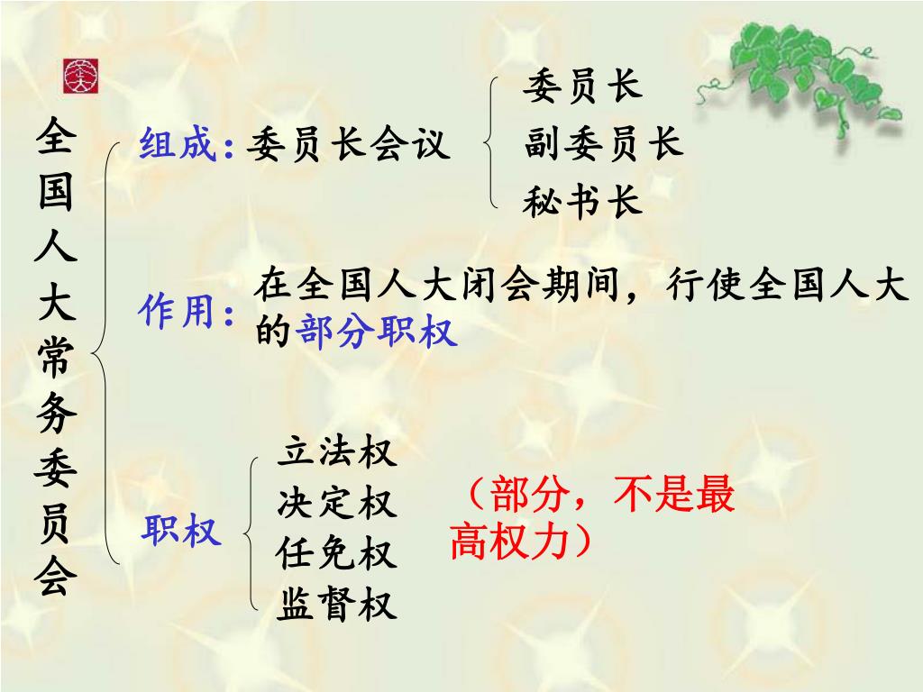 委员长 全国人大常务委员会 组成: 副委员长 委员长会议 秘书长 在全国人大闭会期间,行使全国人大的部分职权 作用: 立法权 (部分,不是最高权力) 决定权 职权 任免权 监督权