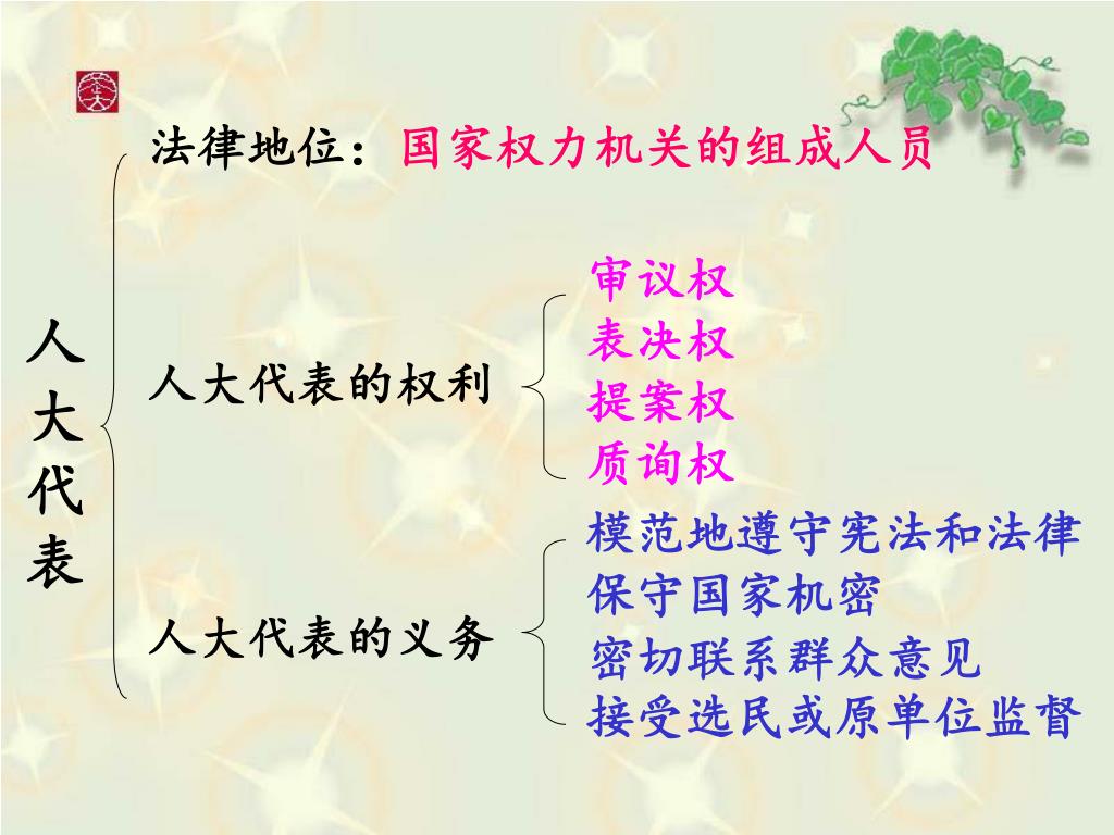 法律地位:国家权力机关的组成人员 审议权 人大代表 表决权 人大代表的权利 提案权 质询权 模范地遵守宪法和法律 保守国家机密 人大代表的义务 密切联系群众意见 接受选民或原单位监督