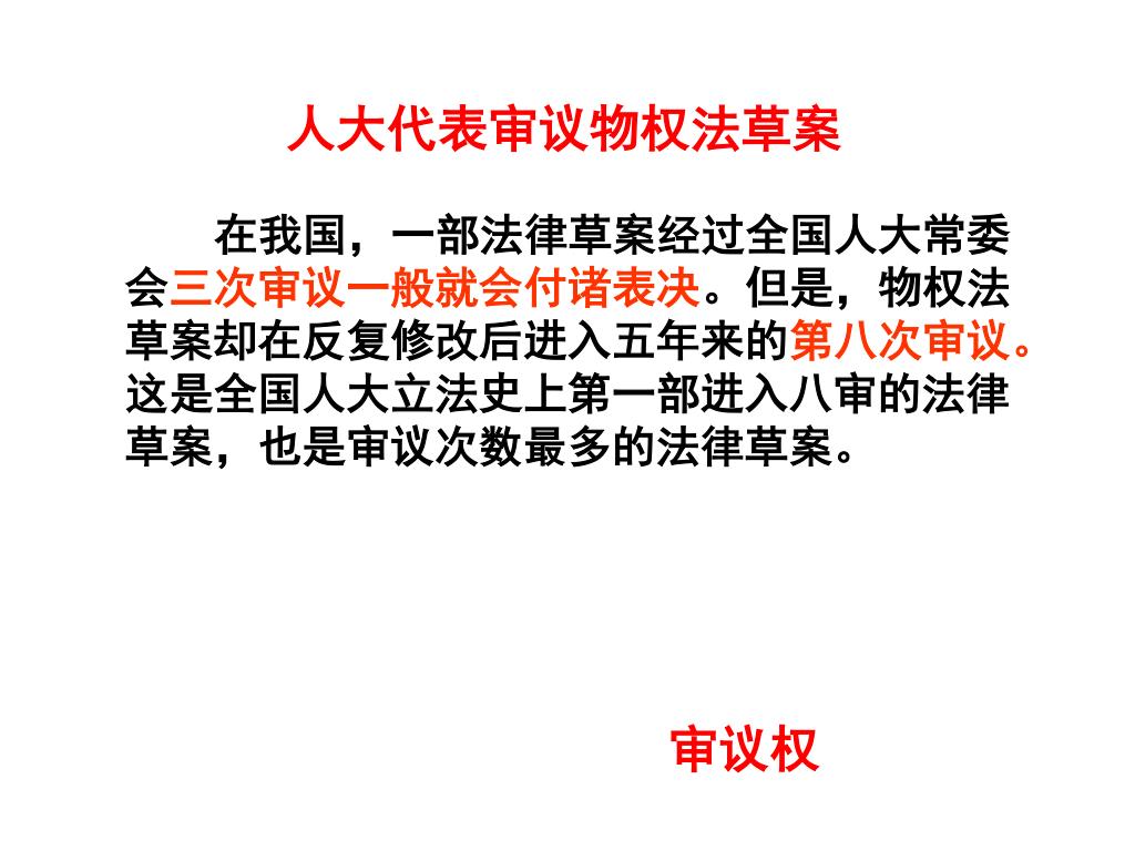 人大代表审议物权法草案 在我国,一部法律草案经过全国人大常委会三次审议一般就会付诸表决。但是,物权法草案却在反复修改后进入五年来的第八次审议。这是全国人大立法史上第一部进入八审的法律草案,也是审议次数最多的法律草案。 审议权