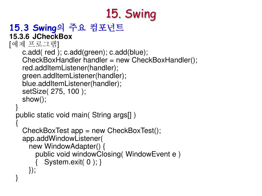 15. Swing 15.3 Swing의 주요 컴포넌트 15.3.6JCheckBox [예제프로그램] privateclassCheckBoxHandlerimplementsItemListener{ Stringmesg=""; publicvoiditemStateChanged(ItemEvente) {JCheckBoxcb=(JCheckBox)e.getSource(); if(cb==red){mesg="Red";} elseif(cb==green){mesg="Green";} else{mesg="Blue";} //상수ItemEvent.DESELECTED도지원된다. if(e.getStateChange()==ItemEvent.SELECTED) {mesg+="isselected";} else {mesg+="isdeselected";} t.setText(mesg); } } }