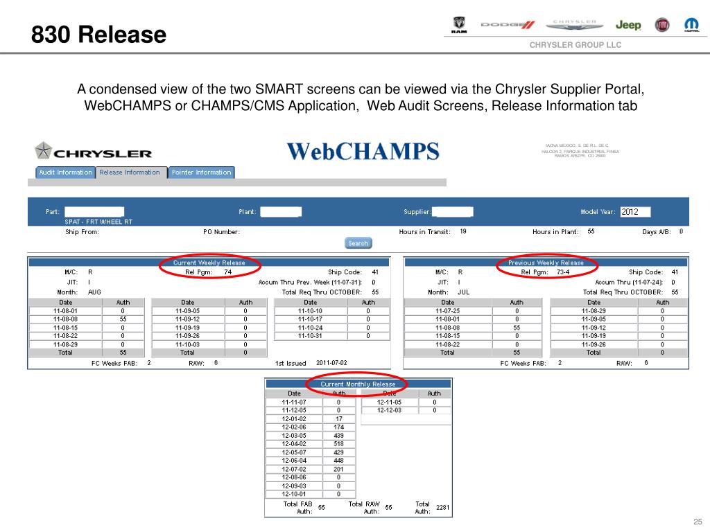 830 Release A condensed view of the two SMART screens can be viewed via the Chrysler Supplier Portal, WebCHAMPS or CHAMPS/CMS Application, Web Audit Screens, Release Information tab