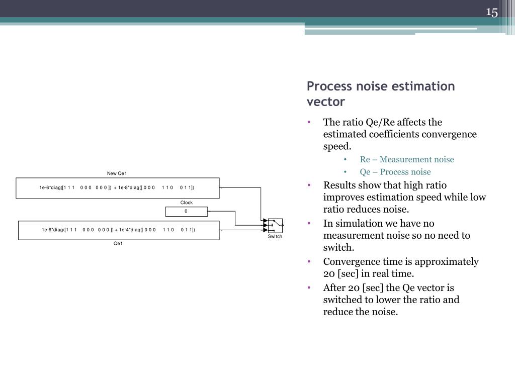 Process noise estimation vector The ratio Qe/Re affects the estimated coefficients convergence speed. Re – Measurement noise Qe – Process noise Results show that high ratio improves estimation speed while low ratio reduces noise. In simulation we have no measurement noise so no need to switch. Convergence time is approximately 20 [sec] in real time. After 20 [sec] the Qe vector is switched to lower the ratio and reduce the noise.