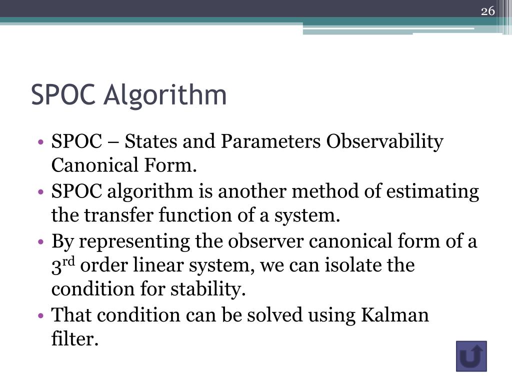 SPOC Algorithm • SPOC – States and Parameters Observability Canonical Form. • SPOC algorithm is another method of estimating the transfer function of a system. • By representing the observer canonical form of a 3rd order linear system, we can isolate the condition for stability. • That condition can be solved using Kalman filter.
