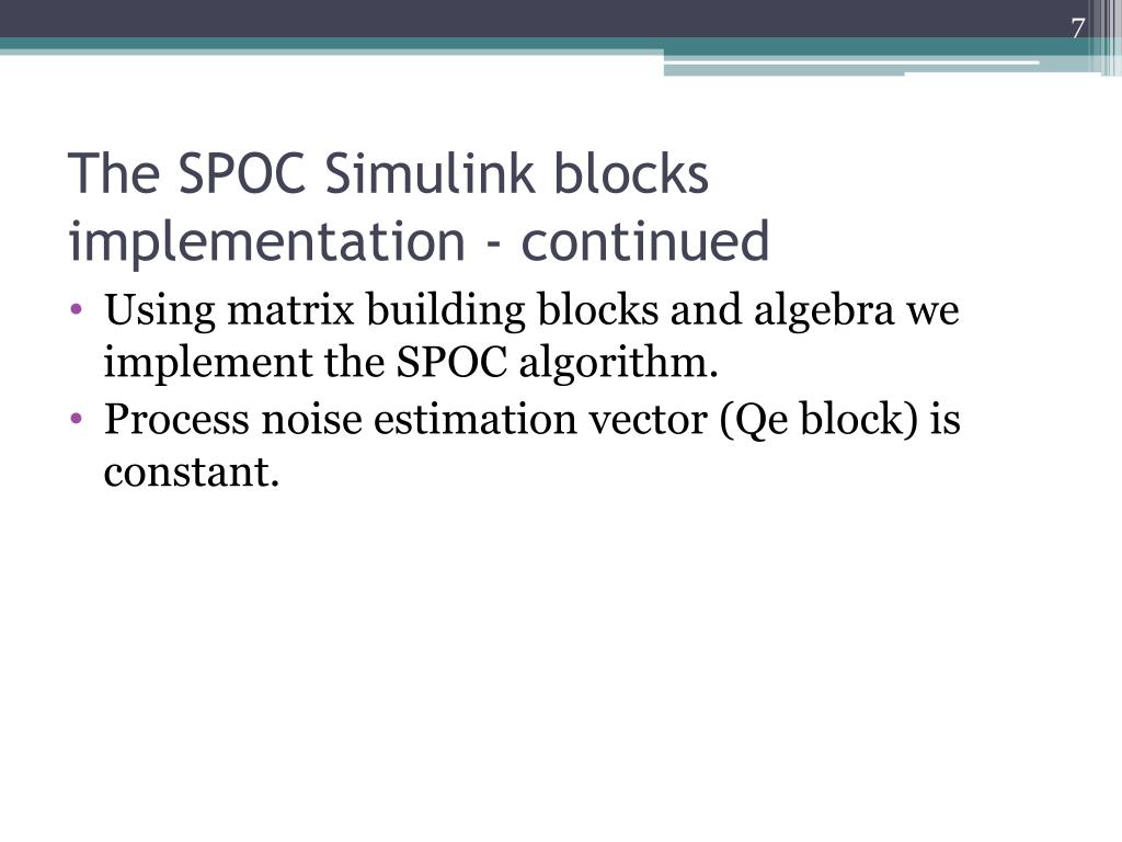 The SPOC Simulink blocks implementation - continued • Using matrix building blocks and algebra we implement the SPOC algorithm. • Process noise estimation vector (Qe block) is constant.