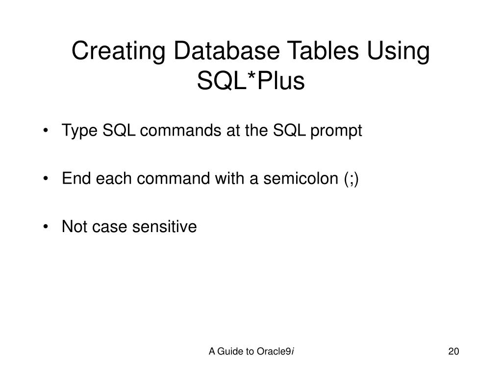 Creating Database Tables Using SQL*Plus • Type SQL commands at the SQL prompt • End each command with a semicolon (;) • Not case sensitive A Guide to Oracle9i