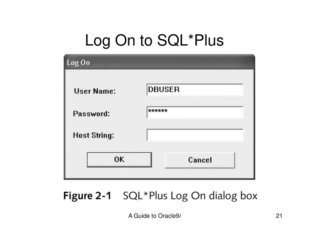 Introduction to SQL • Structured Query Language (SQL): the standard query language for relational databases • Data definition language (DDL) • Create new database objects • Modify or delete existing objects. • Data manipulation language (DML) • Insert, update, delete, and view database data. A Guide to Oracle9i