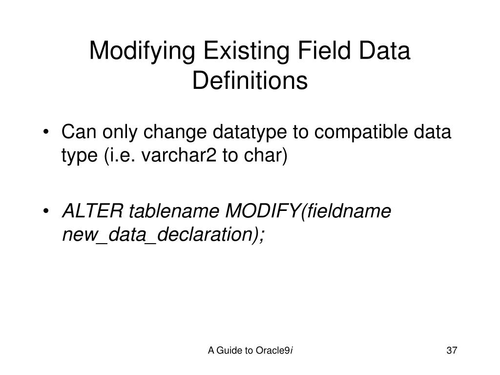Modifying Existing Field Data Definitions • Can only change datatype to compatible data type (i.e. varchar2 to char) • ALTER tablename MODIFY(fieldname new_data_declaration); A Guide to Oracle9i