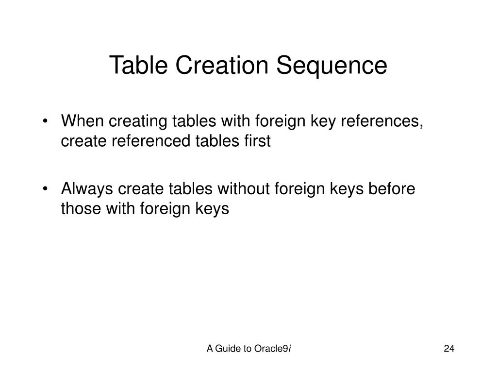 Table Creation Sequence • When creating tables with foreign key references, create referenced tables first • Always create tables without foreign keys before those with foreign keys A Guide to Oracle9i