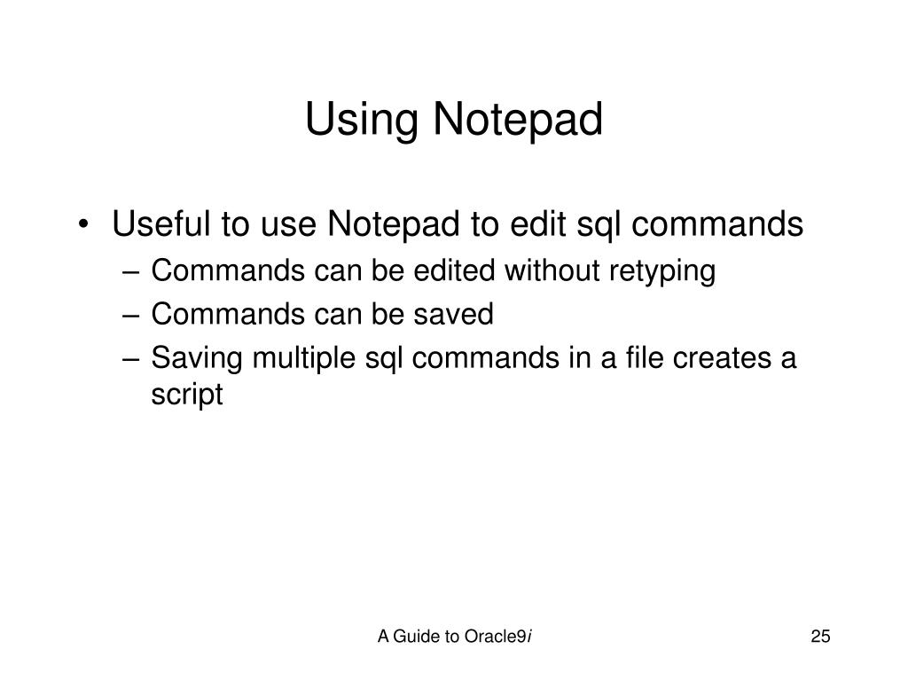 Using Notepad • Useful to use Notepad to edit sql commands • Commands can be edited without retyping • Commands can be saved • Saving multiple sql commands in a file creates a script A Guide to Oracle9i