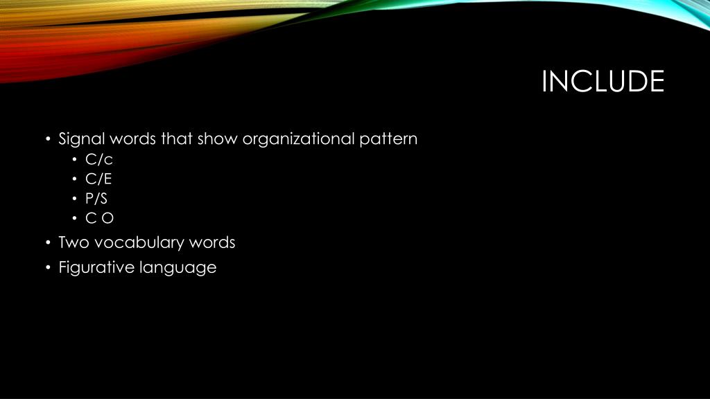 INCLUDE • Signal words that show organizational pattern • C/c • C/E • P/S • C O • Two vocabulary words • Figurative language