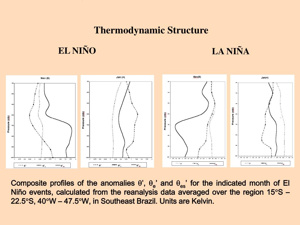 Thermodynamic Structure EL NIÑO LA NIÑA Composite profiles of the anomalies ’, e’ and es’ for the indicated month of El Niño events, calculated from the reanalysis data averaged over the region 15S – 22.5S, 40W – 47.5W, in Southeast Brazil. Units are Kelvin.