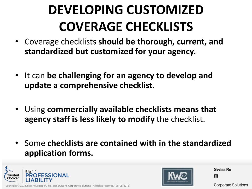 Developing Customized Coverage Checklists • Coverage checklists should be thorough, current, and standardized but customized for your agency. • It can be challenging for an agency to develop and update a comprehensive checklist. • Using commercially available checklists means that agency staff is less likely to modify the checklist. • Some checklists are contained with in the standardized application forms.
