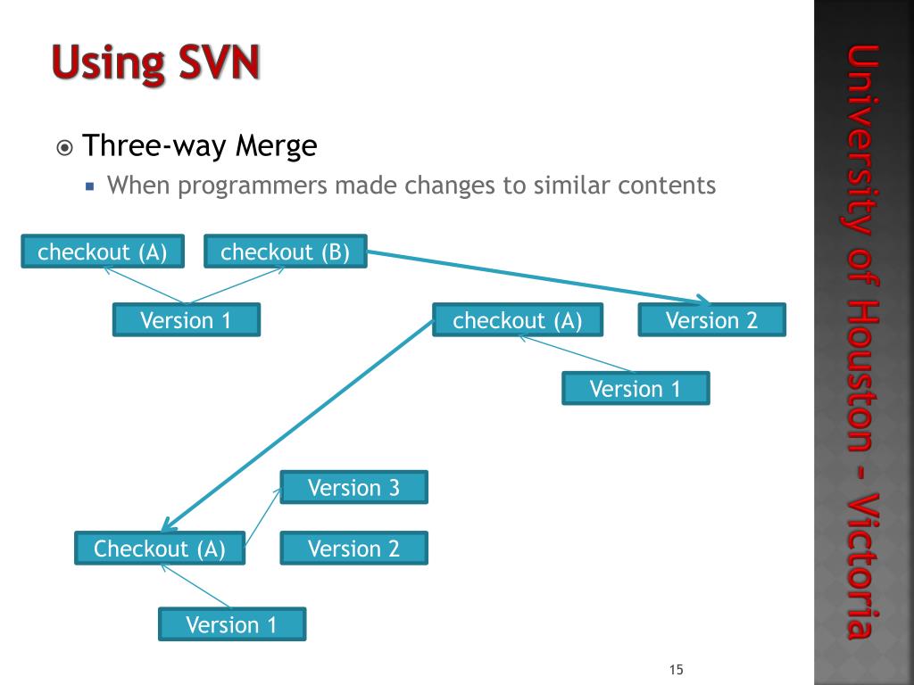 Using SVN • Three-way Merge • When programmers made changes to similar contents checkout (A) checkout (B) Version 1 checkout (A) Version 2 Version 1 Version 3 Checkout (A) Version 2 Version 1