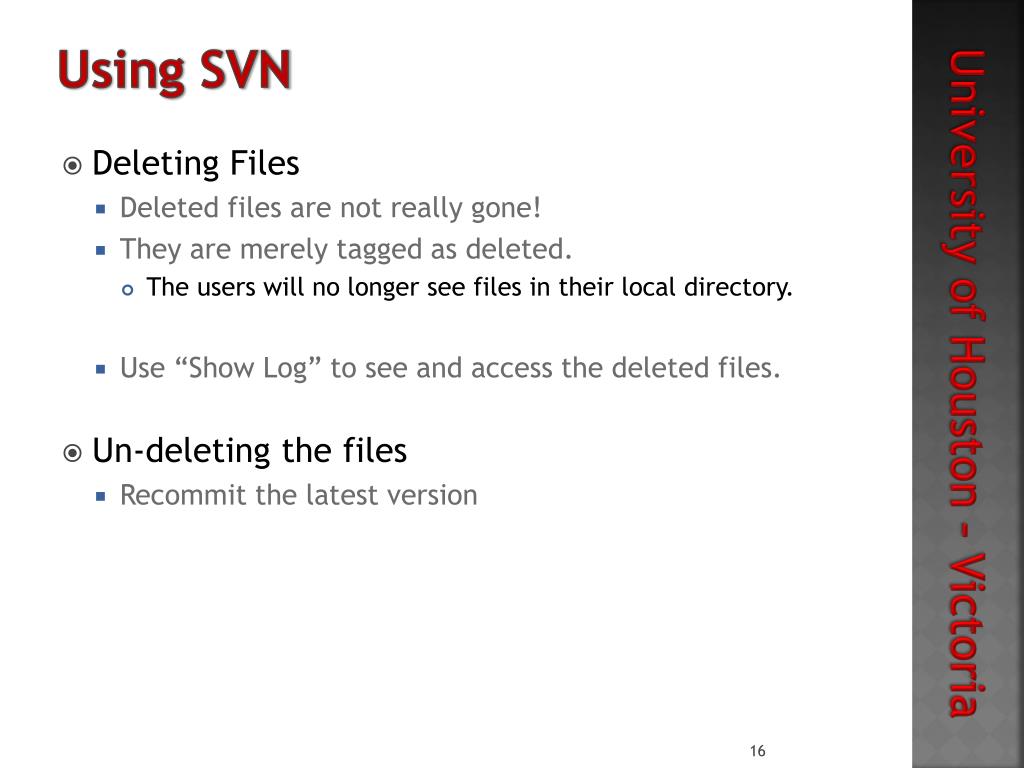 Using SVN • Deleting Files • Deleted files are not really gone! • They are merely tagged as deleted. • The users will no longer see files in their local directory. • Use “Show Log” to see and access the deleted files. • Un-deleting the files • Recommit the latest version