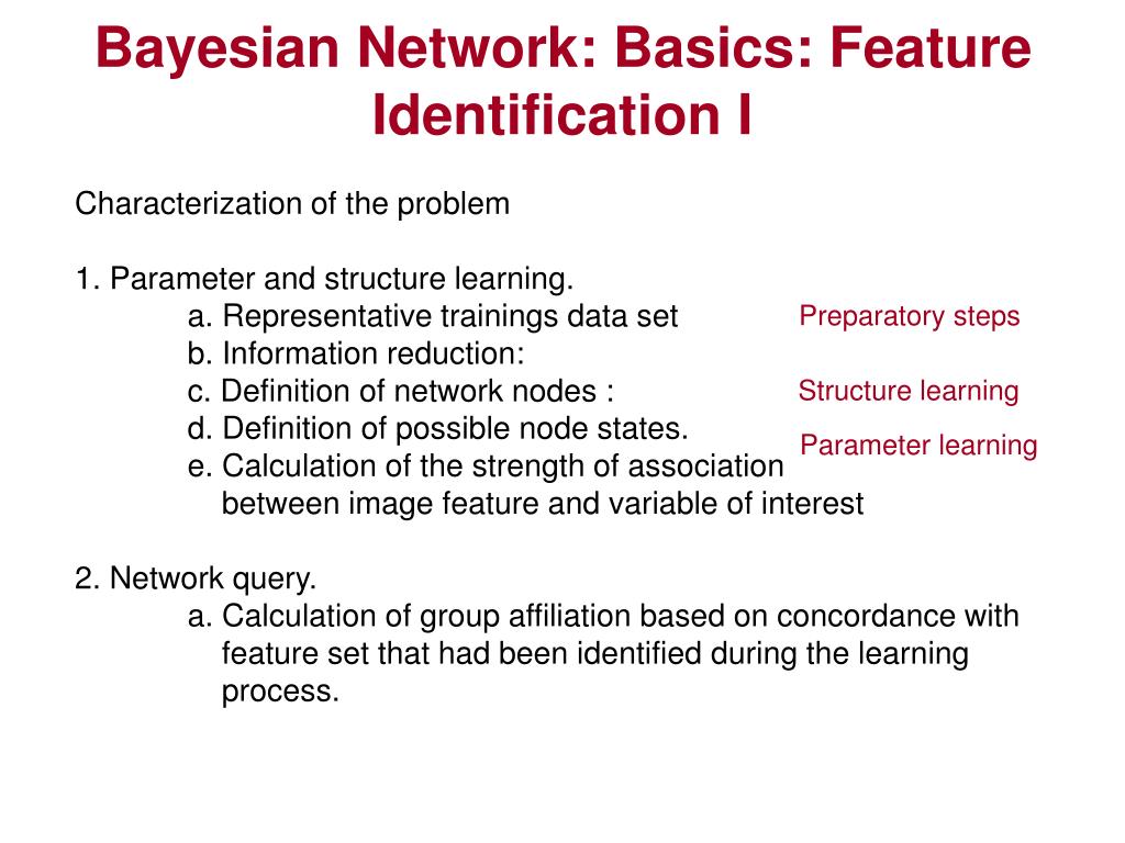 Bayesian Network: Basics: Feature Identification I Characterization of the problem 1. Parameter and structure learning. a. Representative trainings data set b. Information reduction: c. Definition of network nodes : d. Definition of possible node states. e. Calculation of the strength of association between image feature and variable of interest 2. Network query. a. Calculation of group affiliation based on concordance with feature set that had been identified during the learning process. Preparatory steps Structure learning Parameter learning