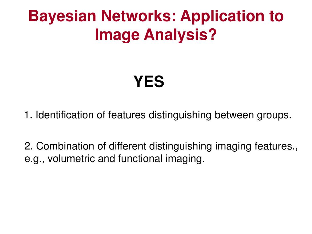 Bayesian Networks: Application to Image Analysis? YES 1. Identification of features distinguishing between groups. 2. Combination of different distinguishing imaging features., e.g., volumetric and functional imaging.