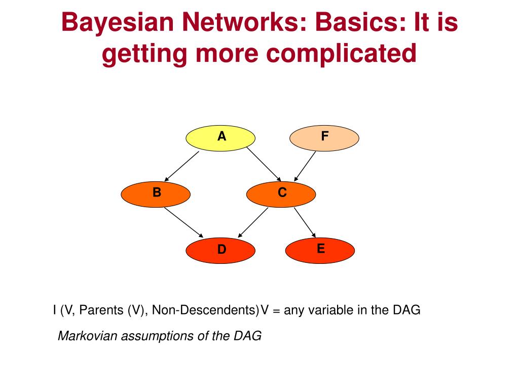 Bayesian Networks: Basics: It is getting more complicated A F B C E D I (V, Parents (V), Non-Descendents) V = any variable in the DAG Markovian assumptions of the DAG