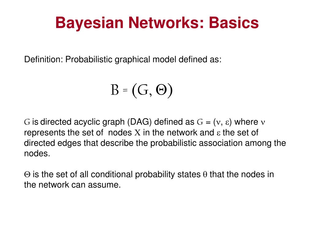 Bayesian Networks: Basics Definition: Probabilistic graphical model defined as: B = (G, Q) G isdirected acyclic graph (DAG) defined as G = (n, e) where n represents the set of nodes C in the network and e the set of directed edges that describe the probabilistic association among the nodes. Q is the set of all conditional probability states q that the nodes in the network can assume.