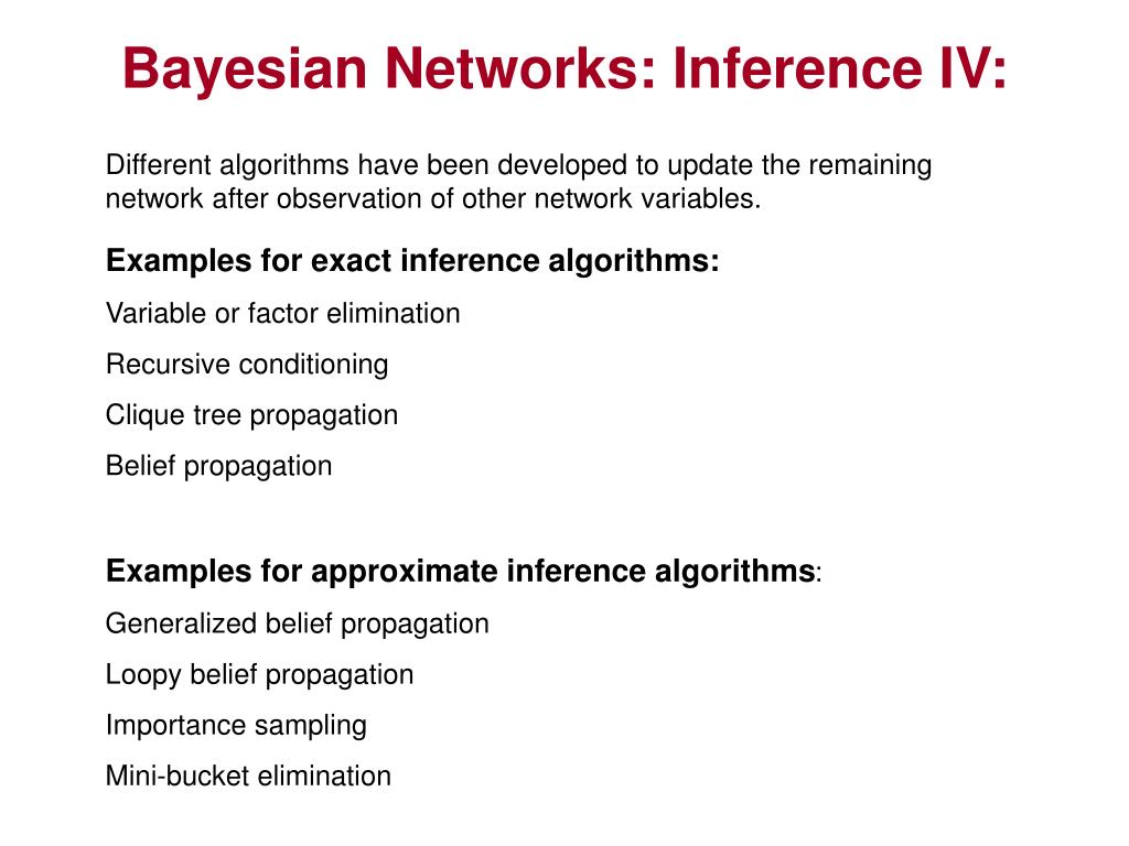 Bayesian Networks: Inference IV: Different algorithms have been developed to update the remaining network after observation of other network variables. Examples for exact inference algorithms: Variable or factor elimination Recursive conditioning Clique tree propagation Belief propagation Examples for approximate inference algorithms: Generalized belief propagation Loopy belief propagation Importance sampling Mini-bucket elimination