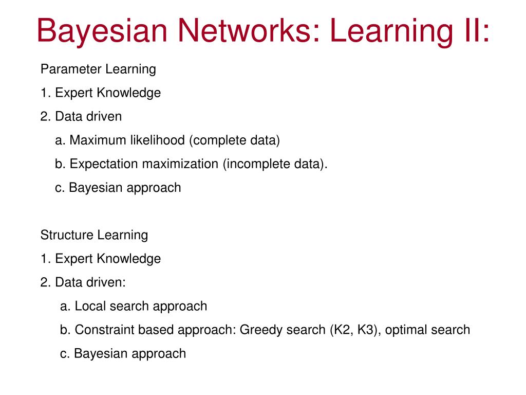 Bayesian Networks: Learning II: Parameter Learning 1. Expert Knowledge 2. Data driven a. Maximum likelihood (complete data) b. Expectation maximization (incomplete data). c. Bayesian approach Structure Learning 1. Expert Knowledge 2. Data driven: a. Local search approach b. Constraint based approach: Greedy search (K2, K3), optimal search c. Bayesian approach